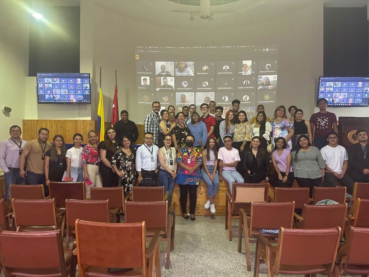Imagen: Estudiantes pasantes presenciales y remotos, investigadores UDI, Directores de Programas y Directora ORI, asistentes al homenaje.